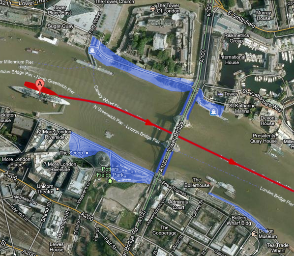 The map shown here illustrates other possible places to watch the ship’s departure, although please take into account that Tower Bridge will be open at the time of leaving.